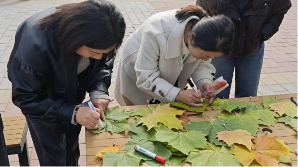 活动现场,机械工程系的志愿者们精心收集了形态各异、色彩斑斓的落叶,并准备了充足的彩笔,热情地邀请过往的师生驻足,在片片落叶上写下自己对长辈、亲人、朋友的思念与祝福。原本随风飘零的落叶,被赋予了全新的生命与情感,化作了一张张承载深情的“明信片”。活动现场气氛热烈,温情涌动。同学们纷纷拿起笔,或沉思,或微笑,认真地在落叶上留下真挚的话语。