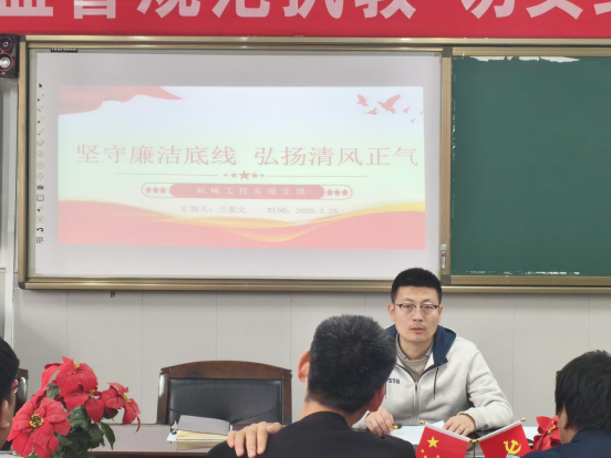 机械工程系党支部书记兰晏文围绕党性修养、师德师风、纪律规矩等内容讲授《坚守廉洁底线弘扬清风正气》廉政专题党课,坚持正面引导与警示教育相结合,引导党员教师带头廉洁从教、立德树人,积极发挥先锋模范作用。