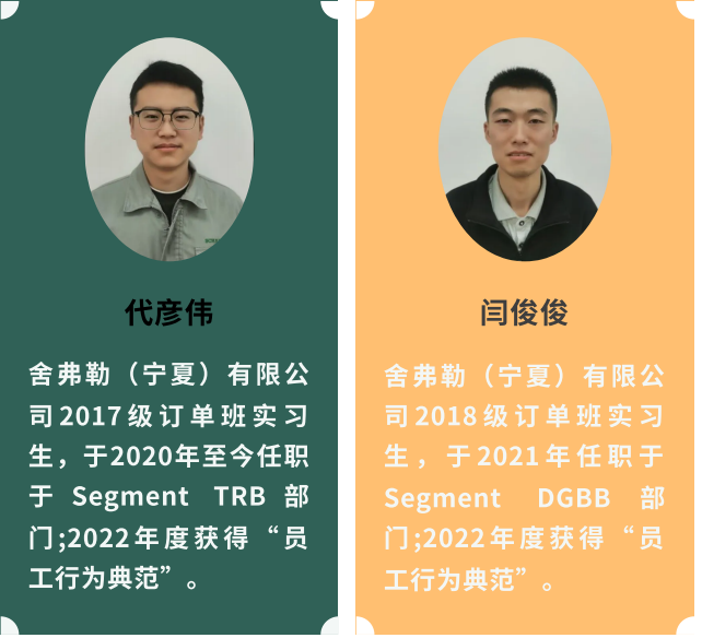 代彦伟是17级机电技术应用(舍佛勒)班学生,闫俊俊是18级电气自动化专业学生。他们分别任职于舍弗勒(宁夏)有限公司SegmentTRB和SegmentDGBB部门,在工作中他们将学校学到的理论知识与实践技能充分融合,勇于挑战、敢于尝试,并快速成长。在面对产线生产任务的压力时,他们经过不断学习和不懈的努力,最终能够独当一面,成为企业的行家里手。