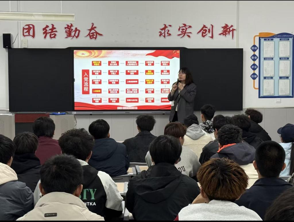 在党员发展流程讲解环节,贾晓春以清晰的时间轴,将党员发展全过程划分为申请入党、入党积极分子确定与培养教育、发展对象确定与考察、预备党员接收、预备党员教育考察与转正五大阶段,结合具象化流程示意图,逐环节明确各阶段责任主体、时间节点与核心要求,让同学们对入党全流程形成系统、清晰的认知。