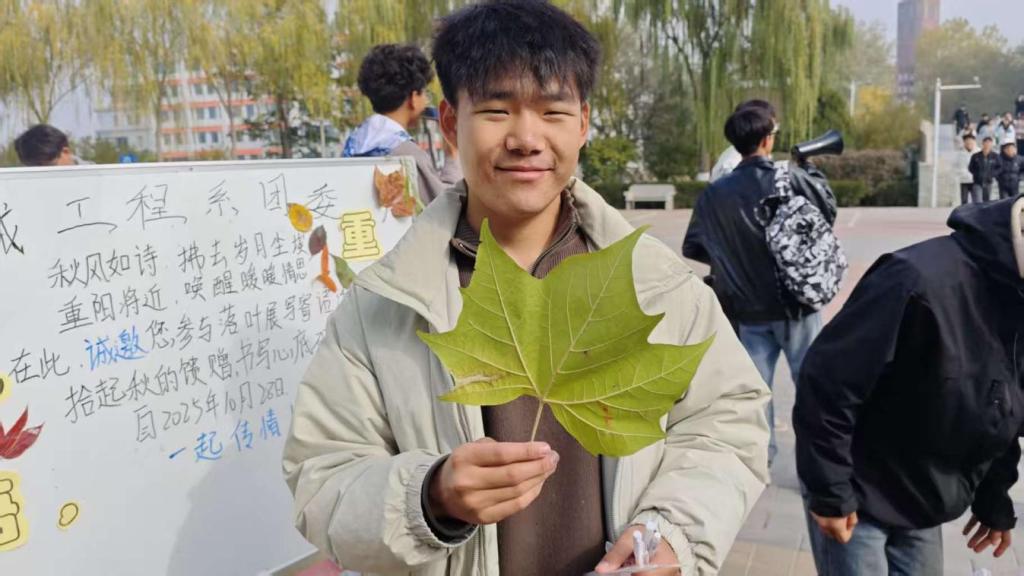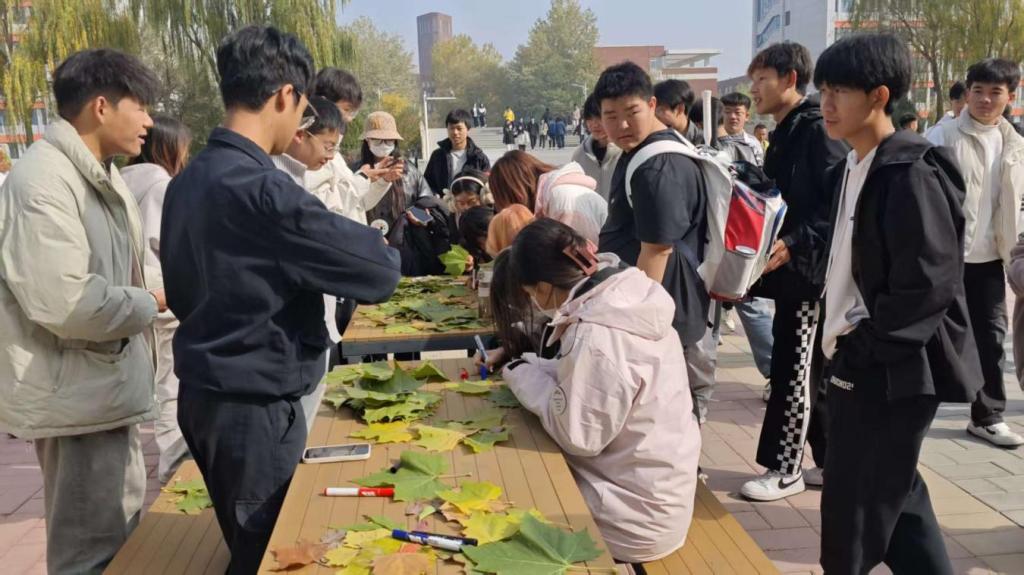 活动现场,机械工程系的志愿者们精心收集了形态各异、色彩斑斓的落叶,并准备了充足的彩笔,热情地邀请过往的师生驻足,在片片落叶上写下自己对长辈、亲人、朋友的思念与祝福。原本随风飘零的落叶,被赋予了全新的生命与情感,化作了一张张承载深情的“明信片”。活动现场气氛热烈,温情涌动。同学们纷纷拿起笔,或沉思,或微笑,认真地在落叶上留下真挚的话语。