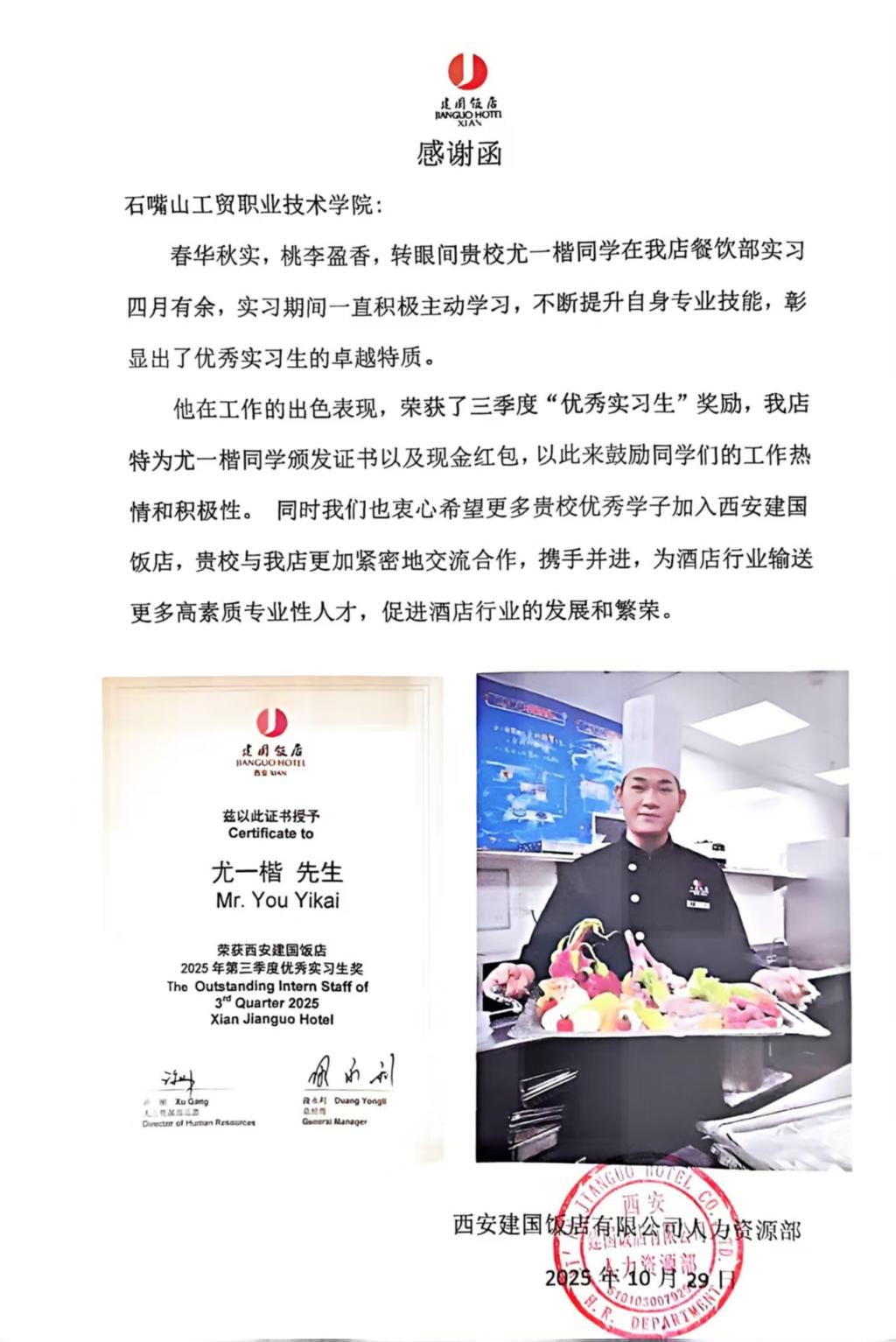 近日,石嘴山工贸职业技术学院收到来自西安建国饭店有限公司人力资源部发来的感谢函,对我院商贸管理系烹饪24201班尤一楷同学在该企业为期四个多月的实习表现予以高度赞扬,并授予其“2025年第三季度优秀实习生”荣誉称号。