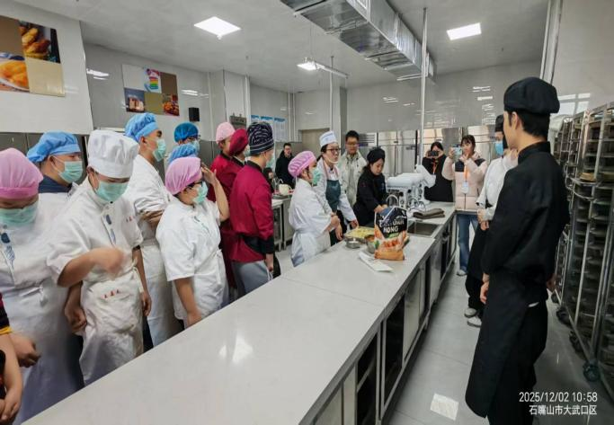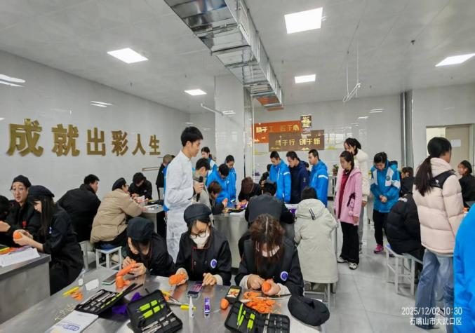 实训课堂成为活动亮点。中餐烹饪实训室内,烹饪专业教师现场演示挂霜花生、拔丝红薯等菜品制作,特校学生围站操作台,紧盯每一处细节;雕刻实训室里,特校学生被栩栩如生的麻雀雕刻作品深深吸引;西式面点实训室内,特校学生换上整齐制服,由烹饪专业学生指导制作肉松小贝,现场氛围热烈。一名特校学生举着沾满肉松的手开心表示:“这是我吃过的最好吃的蛋糕!”