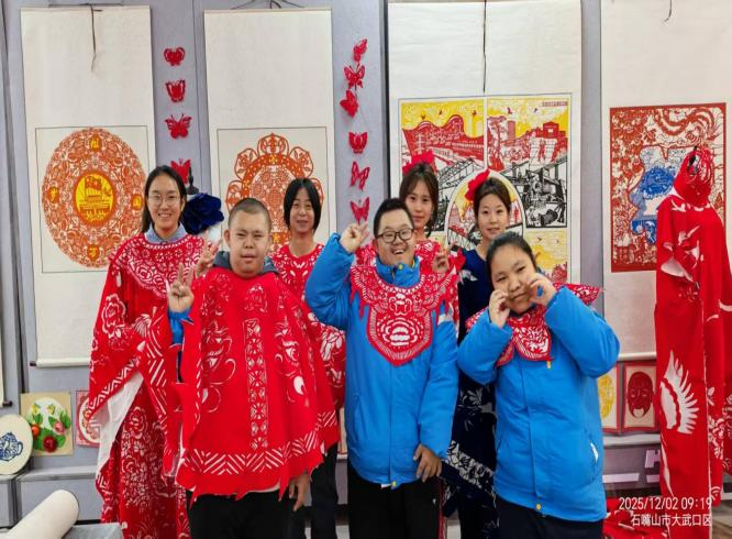 在非遗文化馆(龚丽娟非遗剪纸名师工作室),龚丽娟老师为特校学生详细讲解了剪纸的历史渊源、南北流派差异及现代创新应用。特校学生在互动环节中试穿以剪纸纹样为灵感的创意服装,试戴创意头饰、触摸剪纸油伞,感受传统文化的现代演绎。