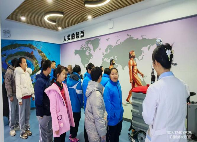 随后,师生们走进生命健康馆,“穿越”至人类进化长河,直观了解从猿到人的演变历程。在人体器官展区,特校学生在引导下好奇观察福尔马林浸泡的器官标本和逼真模型,并亲自操作智能量身高、量血压设备。