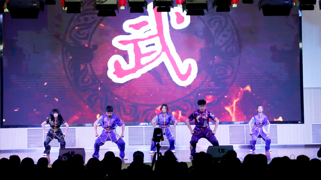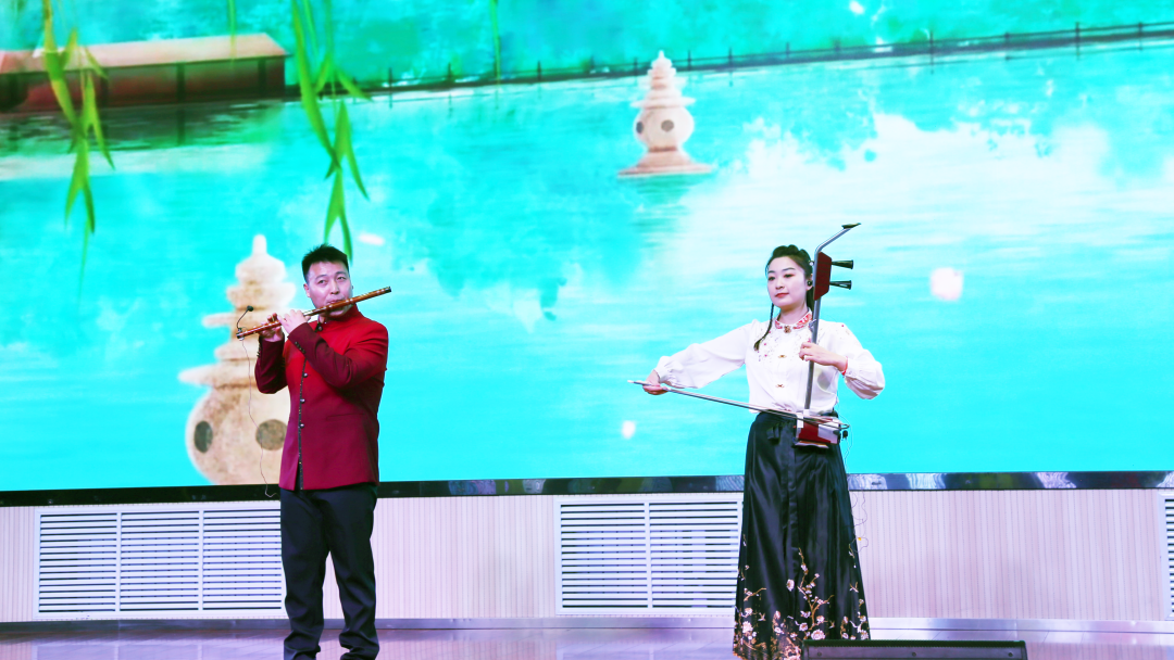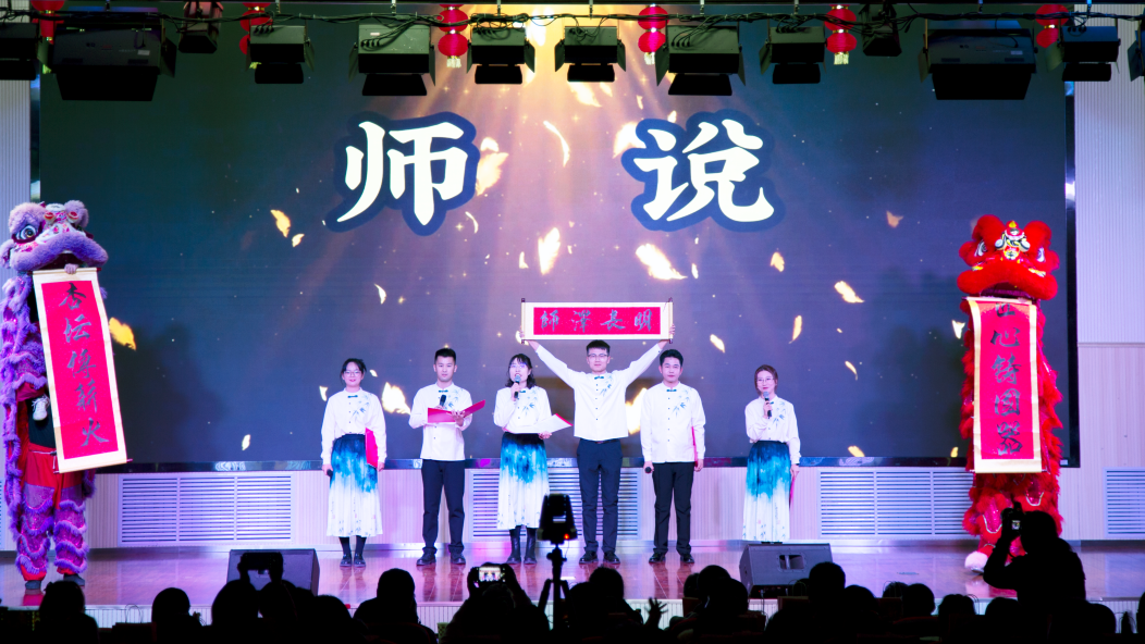 生的多元风采。舞蹈《博回蓝天》跳出工贸人勇攀高峰的豪情,武术表演《武动乾坤》彰显刚毅坚韧的品格;合唱《当那一天来临》《上春山》旋律激昂,传递与学院共奋进、与时代同前行的赤诚;器乐表演《青城山下白素贞》以二胡与长笛的悠扬合奏,勾勒出古典意蕴与现代朝气交融的诗意画卷;朗诵《师说》立足师生日常,用幽默风趣的表达诠释职教人的“师者仁心”,《沁园春·雪》《青春中国》则抒发了职教人的家国情怀与青春担当。