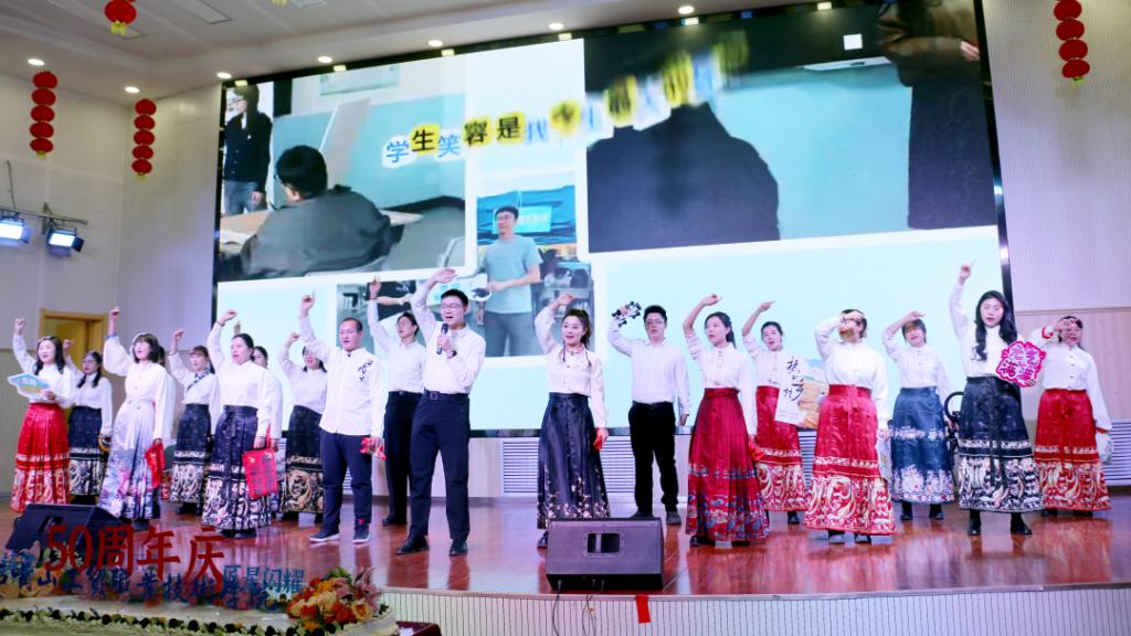 歌曲串唱《光阴的故事》带大家重温学院五十载奋斗岁月,四重唱《以梦为马》唱响追逐教育梦想的壮志豪情;一线教师们带来的《专业大赏·老师来秀》,生动展现“以技立身、以匠育人”的职教特色;非遗剪纸服装秀《贺兰剪韵·西夏霓裳》将传统技艺与美育育人相结合,尽显文化魅力;新型材料现代产业学院的《歌舞喜迎春》与压轴歌伴舞《势不可挡》,以饱满热情为演出画上圆满句号,也奏响了新年奋进的号角。
