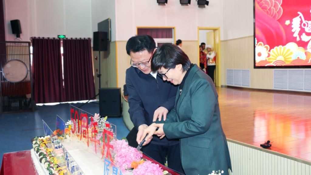 演出期间,最令人动容的当属学院50周年庆典特别环节。由烹饪专业师生精心制作的1.8米巨型蛋糕惊艳亮相,承载着对学院的深情与期盼。宁晓娟书记与何秉海院长共同上台切分蛋糕,全场师生共同见证这一温馨时刻,祝愿学院桃李芬芳、再创辉煌,将演出氛围推向高潮。热场趣味问答环节的互动交流,更让现场暖意融融、欢声不断。