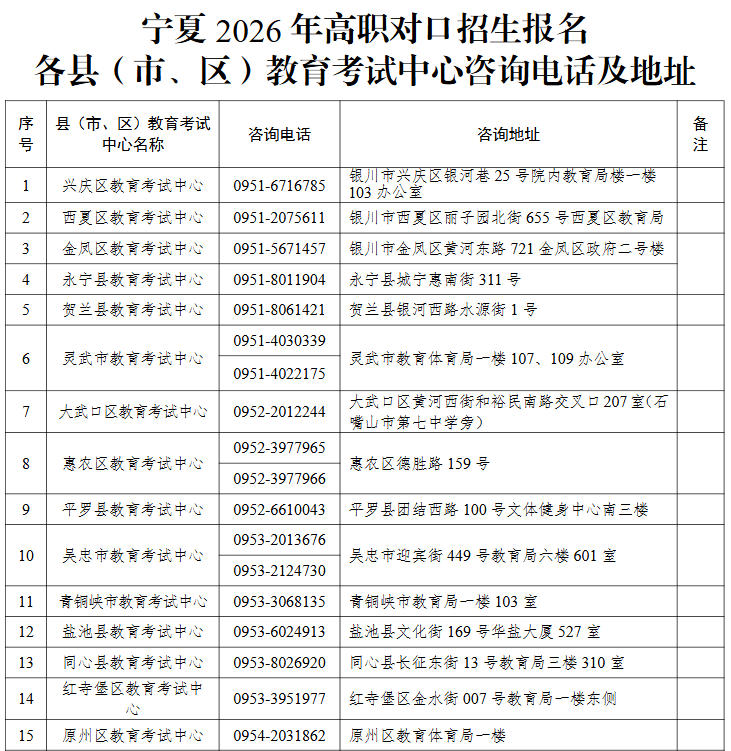 宁夏2026年高职对口招生报名各县(市、区)教育考试中心咨询电话及地址